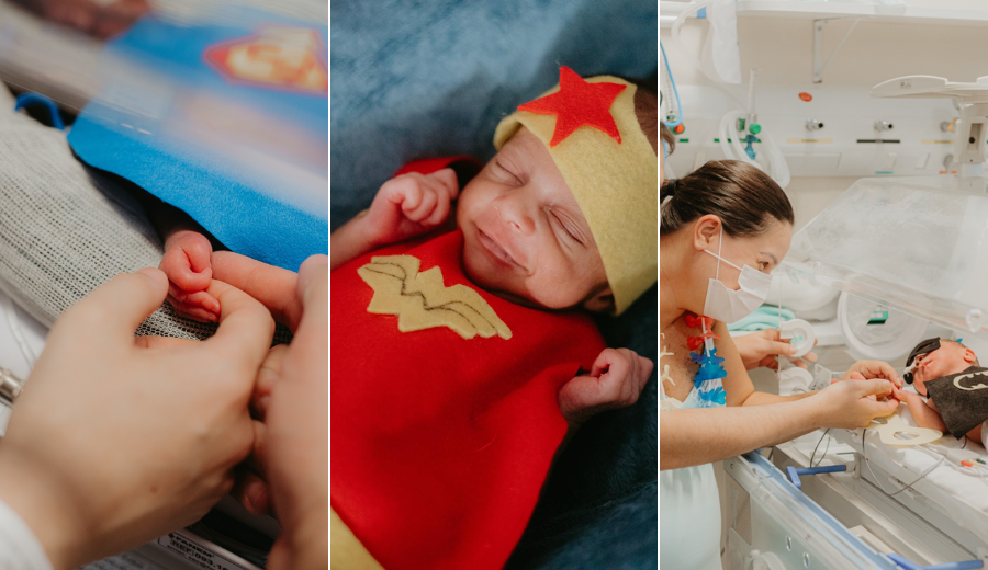 Fantasiados de Homem-Aranha, Batman e Mulher-Maravilha, recém-nascidos da UTI Neonatal protagonizaram momentos de fofura