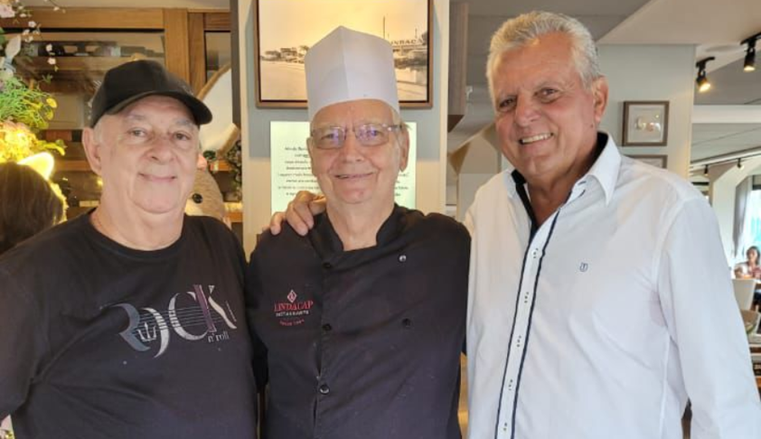 #ENCONTRO DE GERAÇÕES – O diretor do Restaurante Lindacap (direita), Silvio Roberto Bortolotti, ao lado do chef Ivo Schreiber, há 60 anos na casa, e de Paulo Souto, um dos primeiros garçons do restaurante, que escolheu o Lindacap para passar a Páscoa. O encontro se tornou um registro da história do restaurante, construída ao longo de décadas por pessoas que ajudaram a consolidar sua trajetória.