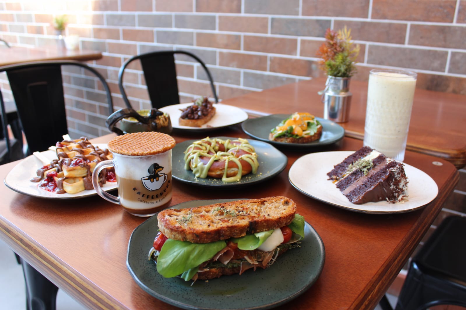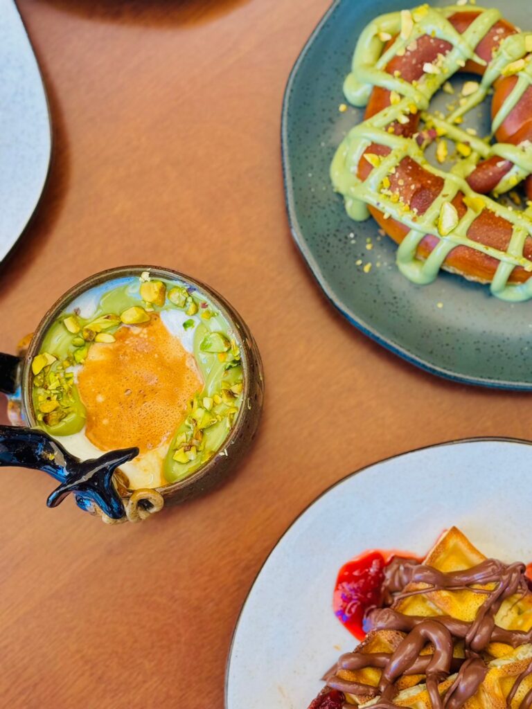O cardápio é outro diferencial, com receitas autorais produzidas no próprio local. Entre as opções estão waffles, bretzels, toasts, bolos e cafés especiais, elaborados sem o uso de produtos industrializados prontos.
