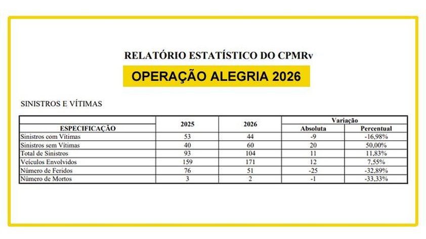 Já nas rodovias estaduais, a Operação Alegria 2026, coordenada pelo Comando de Polícia Militar Rodoviária (CPMRv), registrou 104 acidentes, 44 com vítimas e 60 sem vítimas, envolvendo 171 veículos e 51 feridos. Houve duas mortes, ante três no mesmo período de 2025, representando uma redução de 33% no número de óbitos.