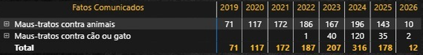 Quando considerados apenas os crimes de maus-tratos contra cães e gatos, o pico aconteceu em 2024, com 120 registros, fazendo daquele ano o mais crítico, com 316 casos comunicados à Polícia Civil, somando todas as tipificações.