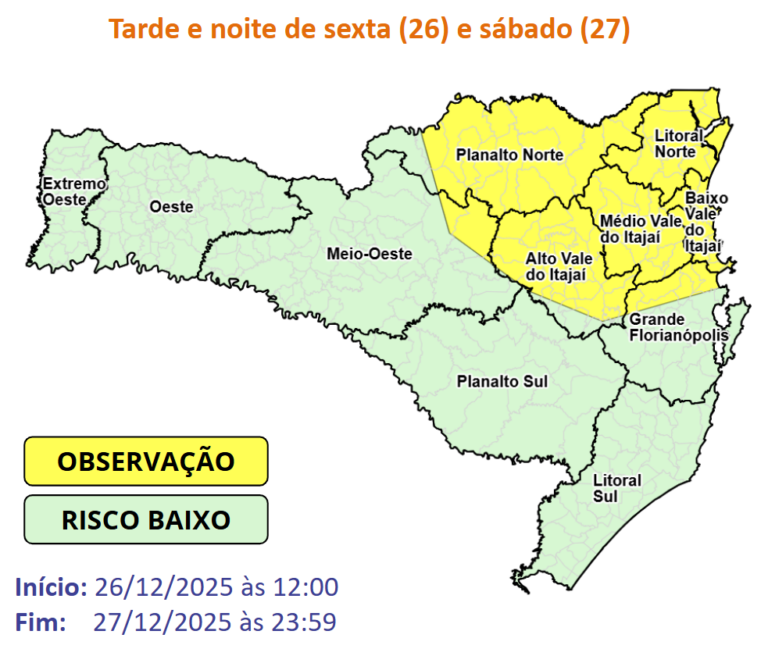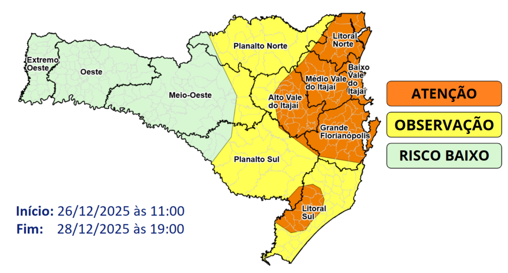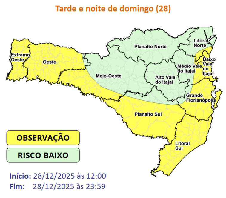 Até domingo, as condições para temporais com chuva pontualmente intensa se mantêm em Santa Catarina. O risco é moderado nas áreas em amarelo e baixo nas áreas em verde, para ocorrências associadas a dsestelhamentos, quedas de galhos e árvores, danos na rede elétrica e, especialmente, alagamentos.