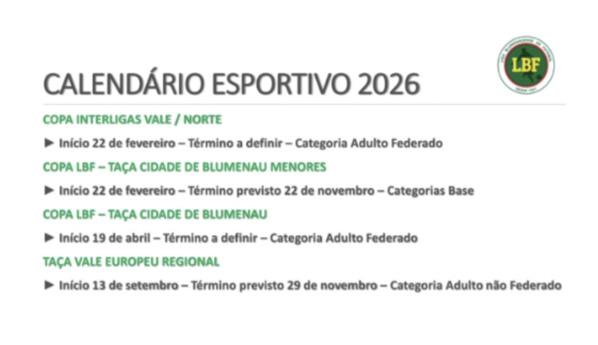 Com novidades a Liga Blumenauense confirmou, através do Departamento de Competições, o calendário 2026.