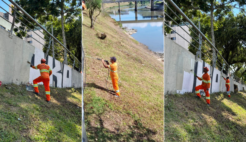 A margem direita do Rio Itajaí-Açu, no trecho entre o Clube Náutico América e a Ponte Adolfo Konder, recebeu serviços de limpeza e revitalização ao longo do fim de semana. A ação foi realizada pela Secretaria de Serviços Urbanos (Sesur) depois do registro de pichações na área durante a semana.