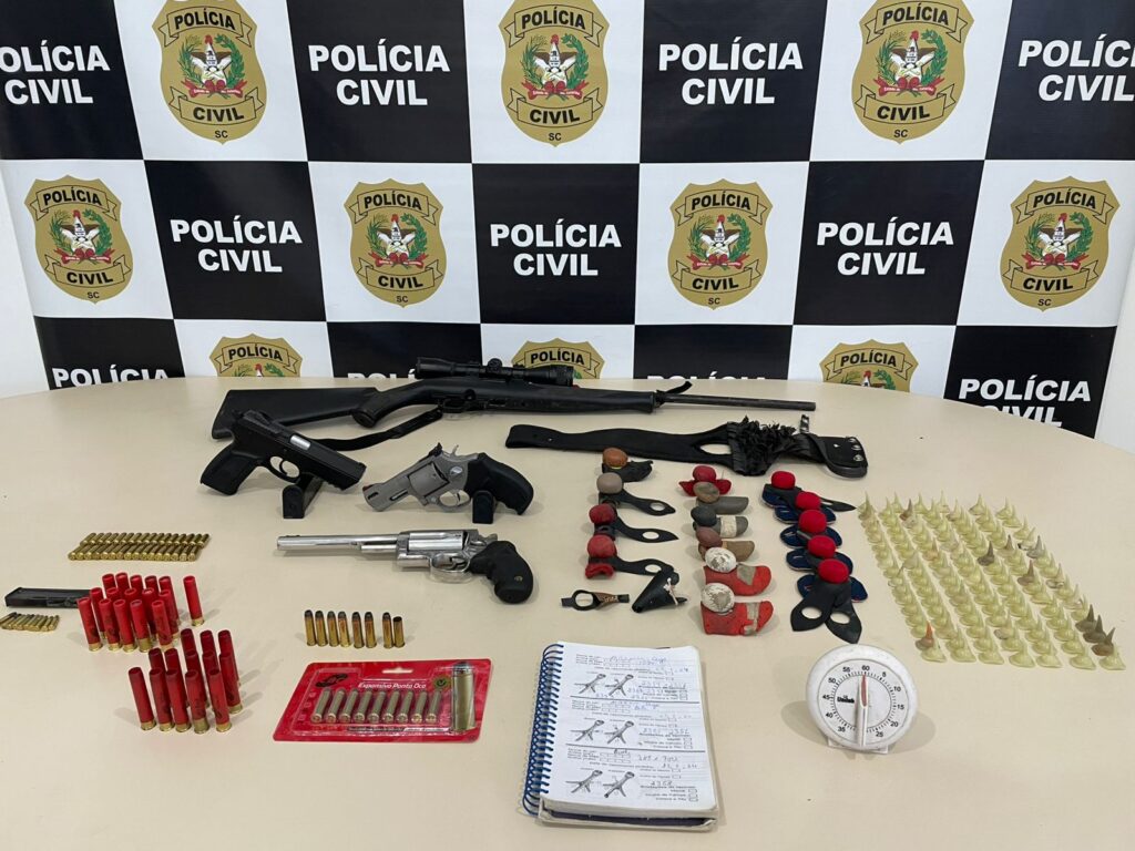 Foram apreendidas quatro armas de fogo, sendo duas de uso restrito (calibres .357 Magnum e 9mm), 56 munições de diversos calibres, duas arenas de combate equipadas com cronômetros e apetrechos para rinhas: esporas, luvas, coletes e outros equipamentos.