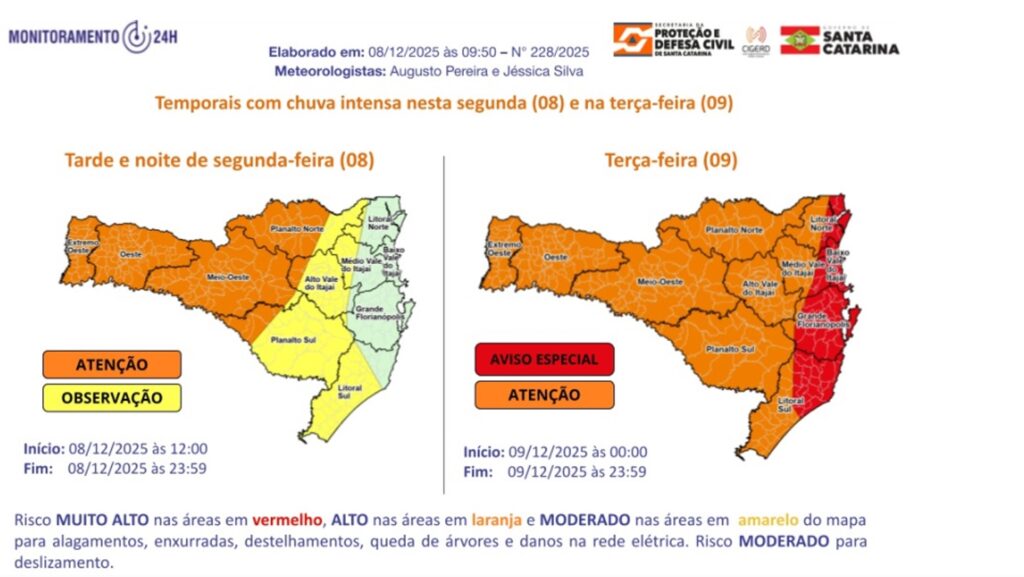 Na terça-feira o risco é alto para ocorrências de alagamentos e enxurradas e risco moderado para deslizamentos. Na quarta-feira, dia 10, com o afastamento do ciclone para alto mar, às instabilidades devem perder força e os temporais acontecem de maneira mais isolada.