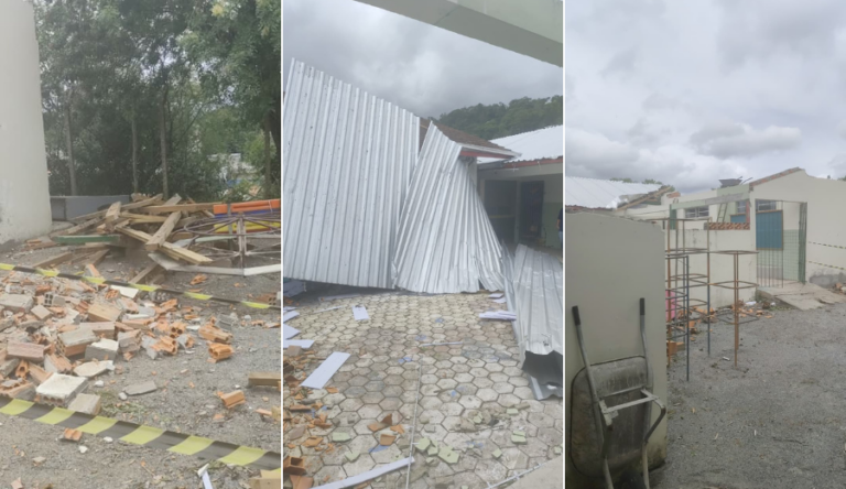 Um forte vendaval no fim da tarde de sábado, dia 6, arrancou o telhado da Escola de Educação Básica Jonas Neves, localizada no bairro Fidélis, em Blumenau. Imagens registradas mostram o momento em que a estrutura cai no chão e os danos provocados pelo vento. Confira: